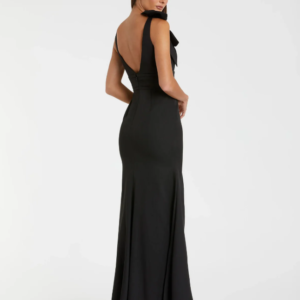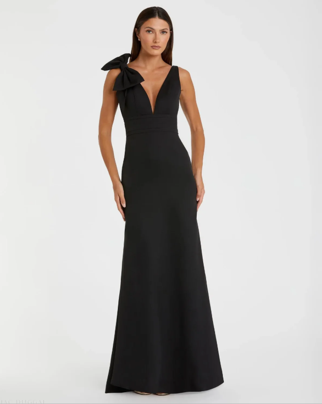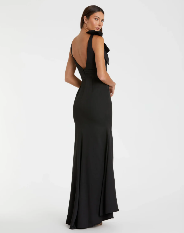 Crafted from crepe fabric, this stunning gown features a v-neckline, an eye-catching bow, and a flattering mermaid silhouette. Ideal for weddings, galas, or evening affairs.