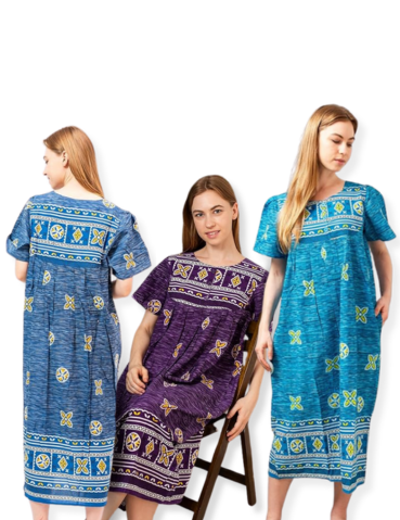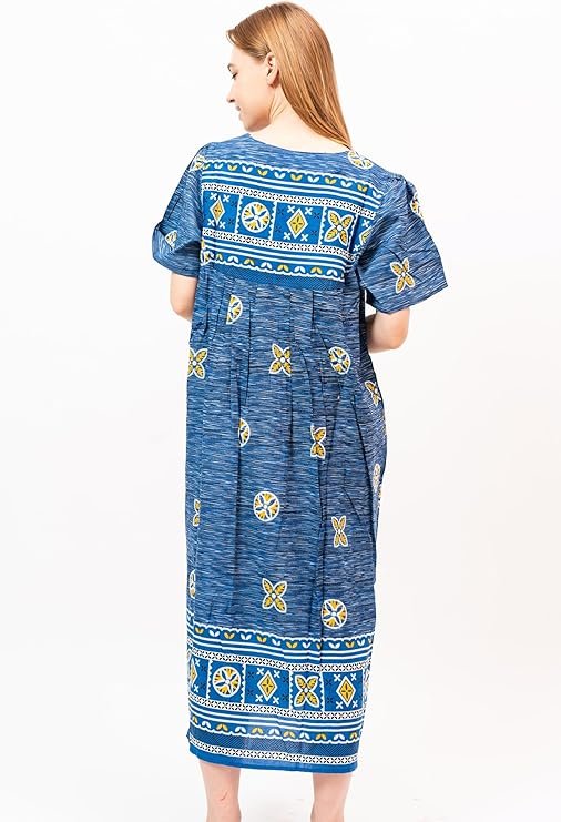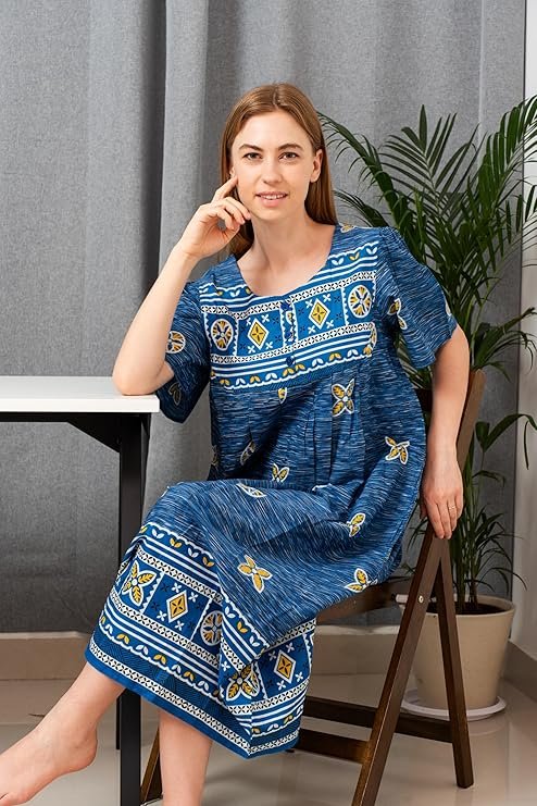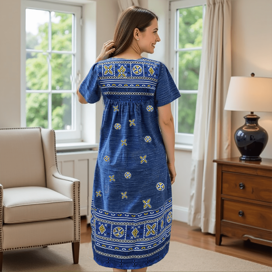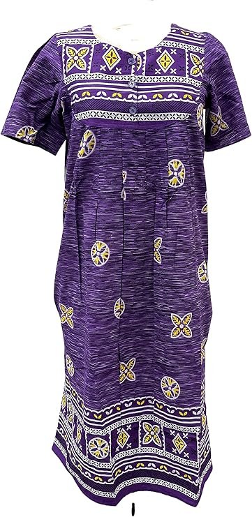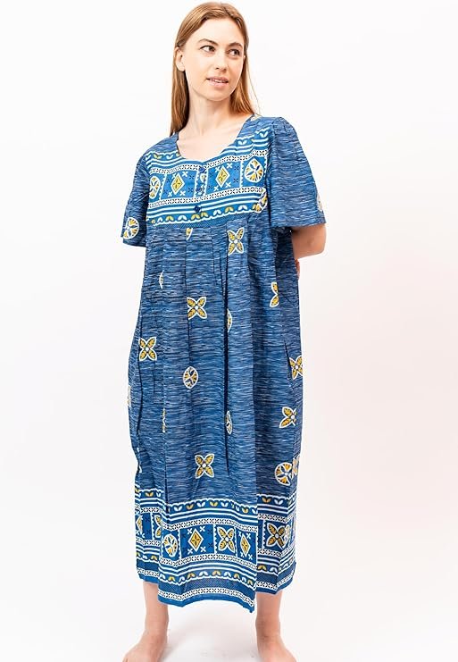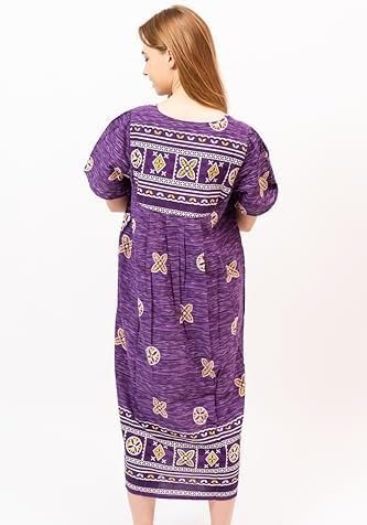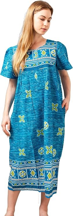 - Roomy sleeves, relaxed fit and below-the-knee length offer comfort in this lounger, whether you’re wearing it as a house dress or going out and about