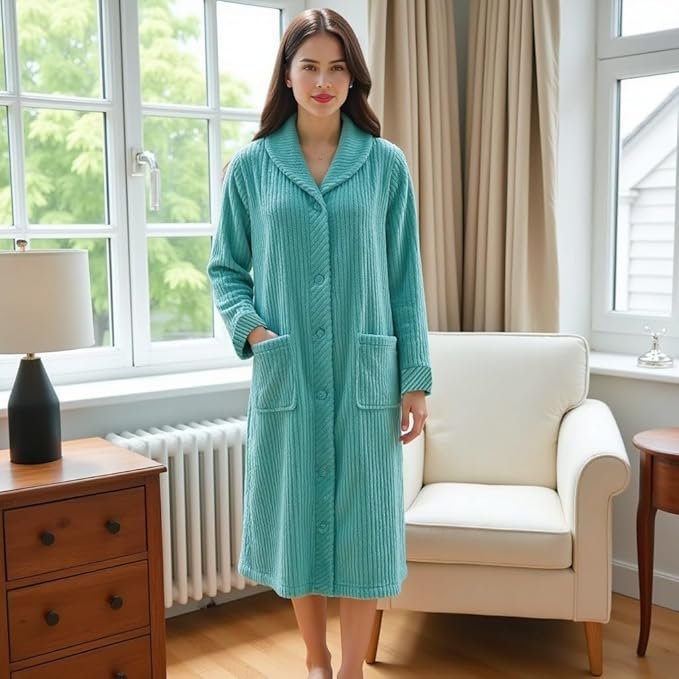 - Cozy Mid-Length Plush Fleece Robe for Women — Experience luxury and warmth with this stylish mid-length robe made from soft coral fleece. Perfect for lounging, bedtime, or casual wear around the house.