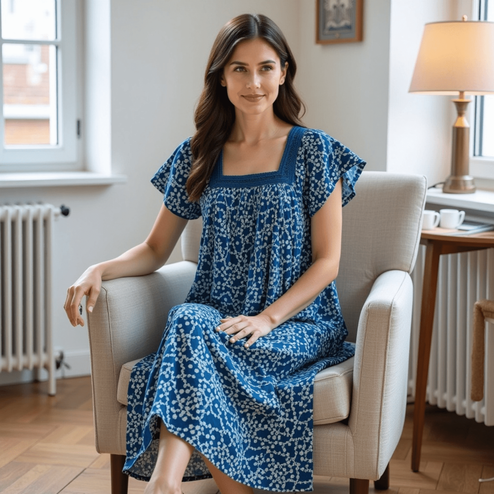 - Roomy sleeves, relaxed fit and below-the-knee length offer comfort in this lounger, whether you’re wearing it as a house dress or going out and about.