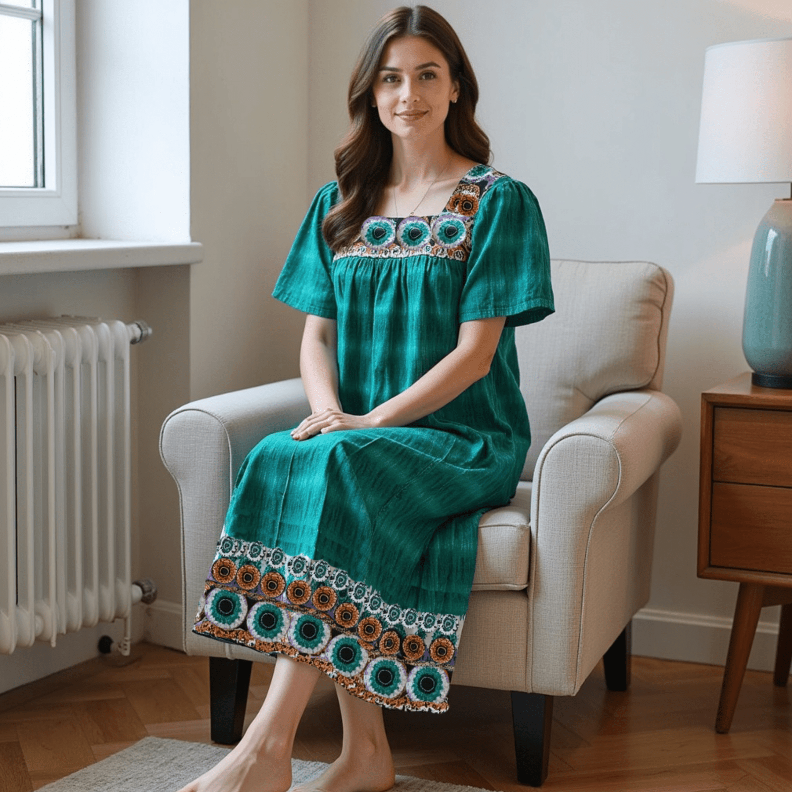 - Roomy sleeves, relaxed fit and below-the-knee length offer comfort in this lounger, whether you’re wearing it as a house dress or going out and about.